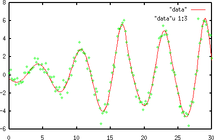 と入力すると,ファイル"data"の1列目をX軸,2列目をY軸としたグラフが得られます.ファイル中で描画に使う列を指定するには,次の例のように入力します.