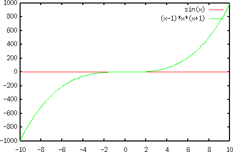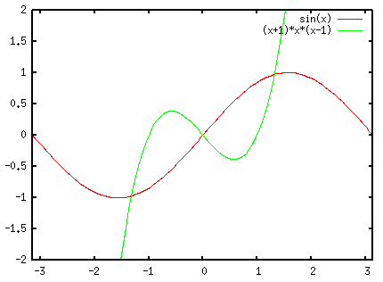 gnuplot> plot sin(x), (x+1)*x*(x-1)