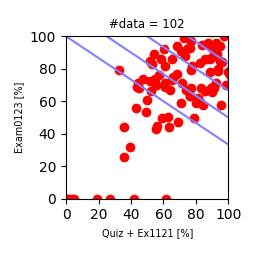 シラバスに記載している通り,この科目の総合評点は,「Quizの得点率」 \( x \) %,「小テストの得点率」\( y \) %,「期末試験の得点率」\( z \) %のとき,次式で算出します.