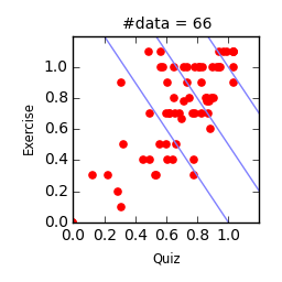 - 横軸: Quizの得点率,縦軸: 演習課題の得点率