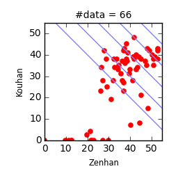 - 直線は上から順に,前半の総合評点が50点,40点,30点のライン