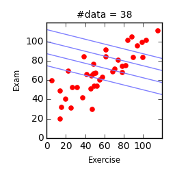 宿題の得点率(横軸)と試験の得点率(縦軸)の相関.青い直線は下から順に,総合成績60点,70点,80点,90点のライン