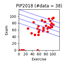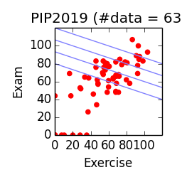宿題の得点率(横軸)と試験の得点率(縦軸)の相関.青い直線は下から順に,総合成績60点,70点,80点,90点のライン