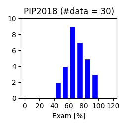 定期試験受験者の点数分布. 宿題も定期試験もおまけ要素があり,さらに宿題のおまけ課題分を加点しているので,到達可能な最高点は100点を超えます(2019年度の場合)でした.100点以上の点数は次の通り: 102点 1名