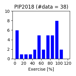 受験者の得点率[%]の分布. おまけ要素があるので,到達可能な得点率は最高110%(2019年度の場合).100%以上の得点率は次の通り: 107% 1名,100% 1名