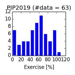 授業で課した宿題の得点率[%]の分布.おまけ要素があるので,到達可能な得点率は最高115%(2019年度の場合).宿題の「おまけ課題」分はここには含んでいない. 100%以上の得点率は次の通り: 104% 1名