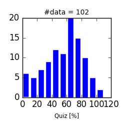 - Quiz01からQuiz08までの得点合計から算出.Quiz01 は5点,Quiz02からQuiz08 は10点で,Quizの合計は最大75点.ただし,70点を満点とみなす.
