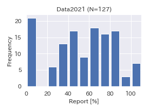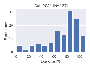 「Quiz」,「実習課題(Exercise)」,「試験(Exam)」,「レポート(Report)」の得点率[%]の分布. 「Quiz」と「Exercise」はおまけ要素があるので100%を超えているひともいます.
