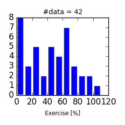 授業で課した宿題の得点率[%]の分布.おまけ要素があるので,到達可能な得点率は最高113%(2017年度の場合). 100%以上の得点率は次の通り: 111%, 107%, 104%, 101%, 100%, 100%, 100%