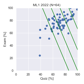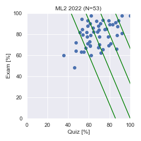 「Quiz vs 小テスト」の斜めの線は,左下から右上に向かって,最終評点60点,70点,80点,90点のラインを表しています.